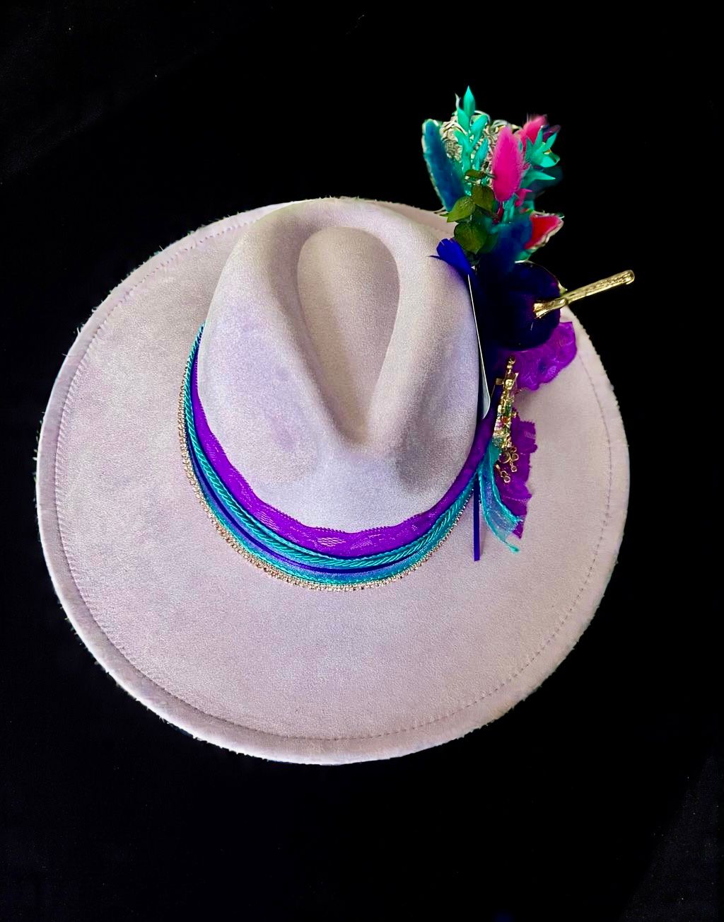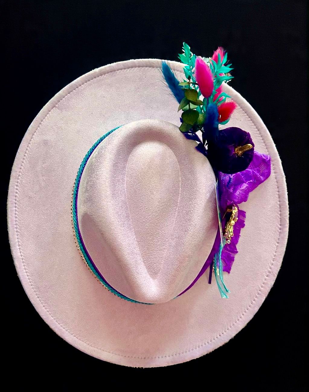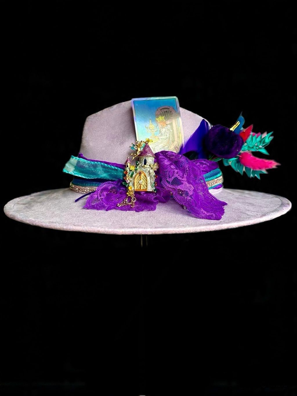 Alexis Lavender's soft, lavender-purple vegan suede fedora and wide brim are fit for royalty, and her intricate embellishments are the perfect reflection of her fierce and adventurous spirit. The holographic tarot card adds a touch of mystique, while a golden castle charm suspended from a ribbon around the brim serves as a reminder that she's the one in charge.